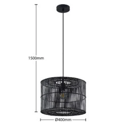 Rabiya ist eine Pendelleuchte, die im sogenannten Boho-Style gehalten ist und einen natürlichen Schirm aus Bambusgeflecht besitzt. Das Licht wird durch die Bambusstreben immer wieder unterbrochen und tritt daher effektvoll und in Streifen an die Umgebung, so dass dort ein schönes Spiel aus Schatten und Lichtschein entsteht. Die Oberfläche des Schirms ist schwarz getönt und die natürliche Ausstrahlung der Hängelampe erhält damit eine etwas kühlere und markantere Note, wobei das Lichtbild dennoch sehr gemütlich erscheint. Eine extrawarme Lichtfarbe beim gewählten Leuchtmittel kann diesen Effekt verstärken.