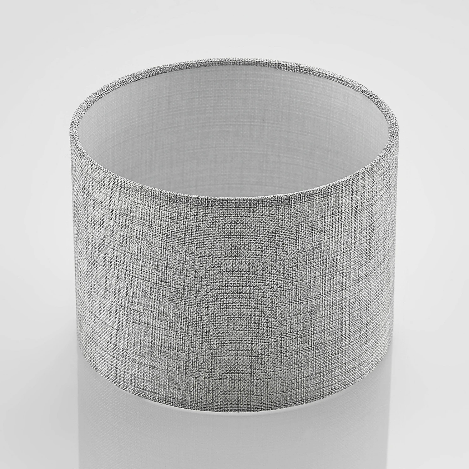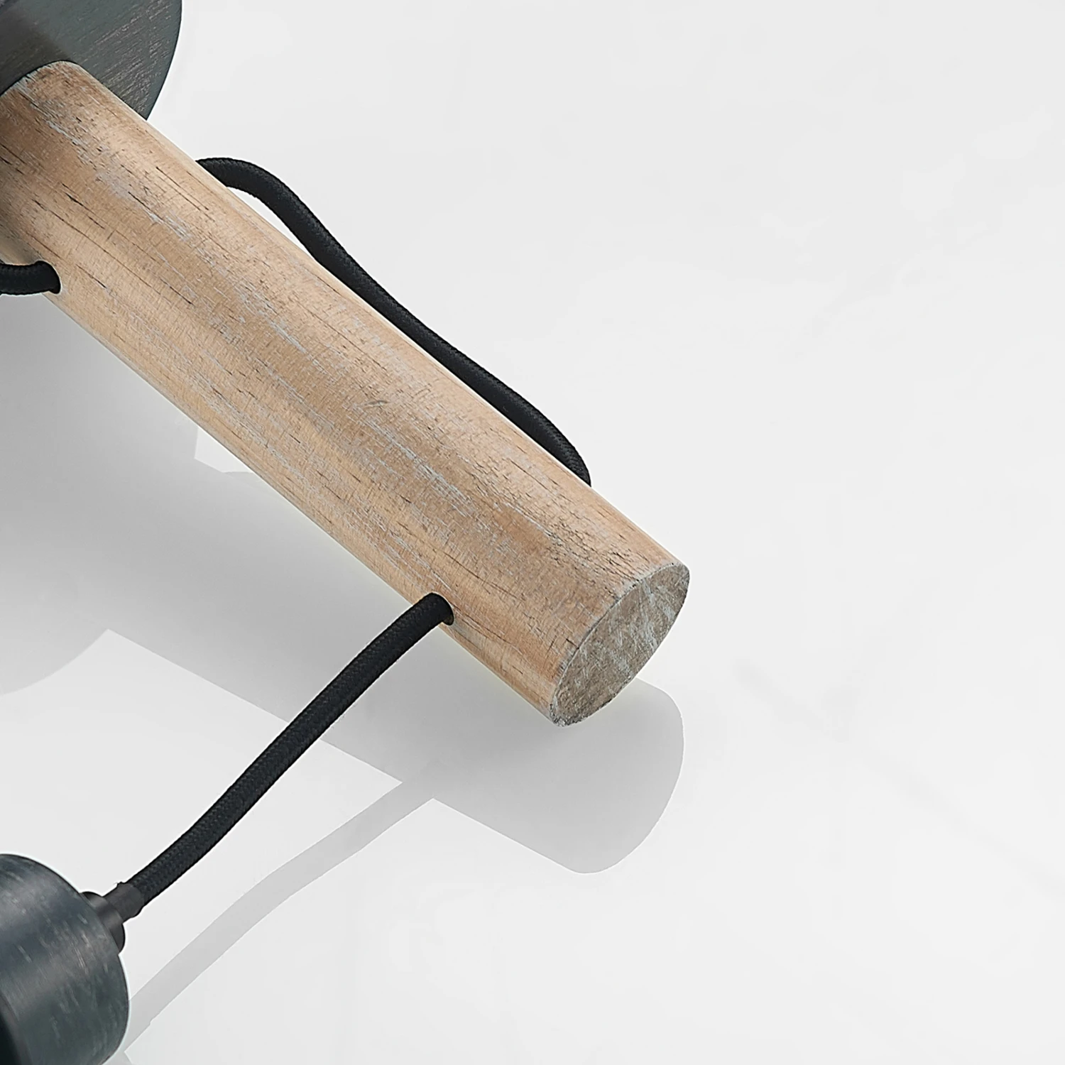 Der Leuchtenschirm ist zylindrisch geformt und besteht aus Textil. Dies bildet einen schönen Materialkontrast zum Gestell aus Kiefernholz und Eisen.