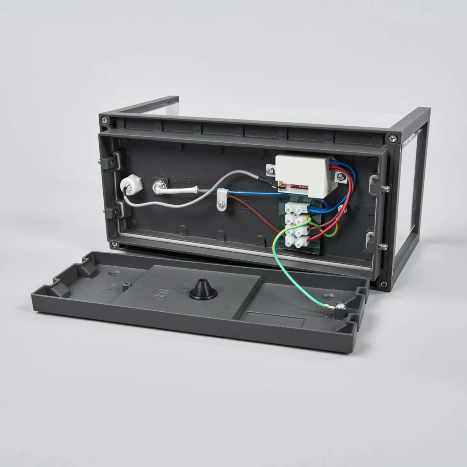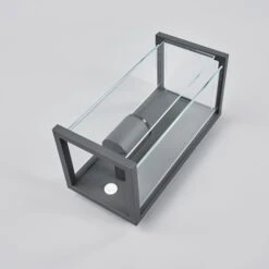 Annalea besitzt eine moderne Optik, denn die Außenwandlampe setzt sich aus einem Aluminiumrahmen und ergänzenden Glasscheiben mit klarer Oberfläche zusammen. Man setzt eine A60-Lampe mit E27-Sockel ein und kann dabei selbstverständlich auch auf LED-Lampen zurückgreifen. Das Gesamtdesign mit der dunkelgrauen Oberfläche und der eckigen Gestalt kleidet die Umgebung moderner Bauten besonders gut.