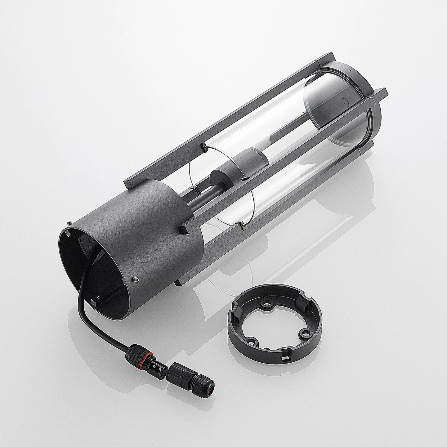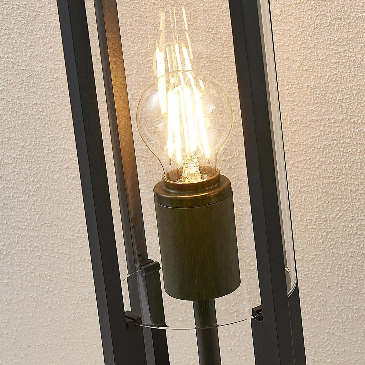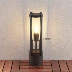 Die Sockelleuchte Brienne besteht aus einem grafitfarbenen Gestell aus Aluminium, das zwischen seinen vier Streben einen gläsernen Schirm hält. Der Glasschirm schützt das Leuchtmittel vor Wind und Wetter und sorgt gleichzeitig für eine direkte Beleuchtung. Die Form- und Farbgebung der Leuchte machen Brienne zu einem modernen Lichtakzent, der sich vor allem in zeitgemäße Architektur einfügt.