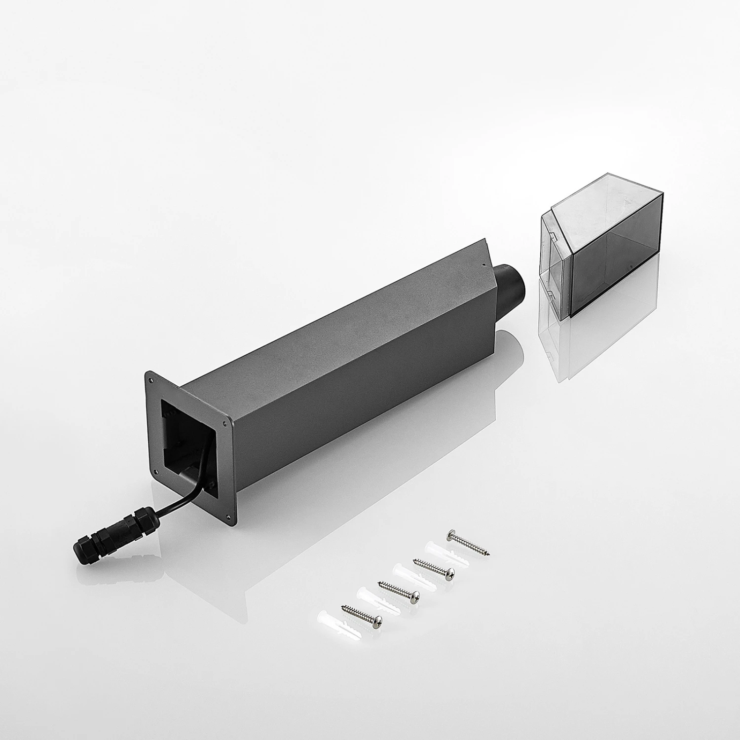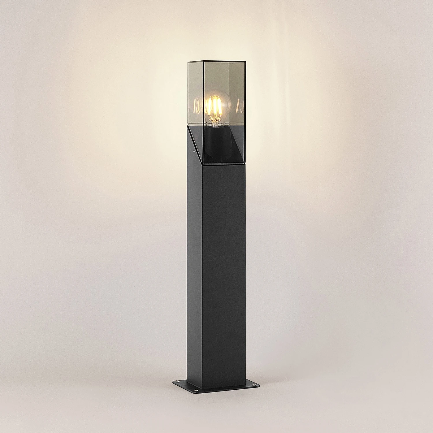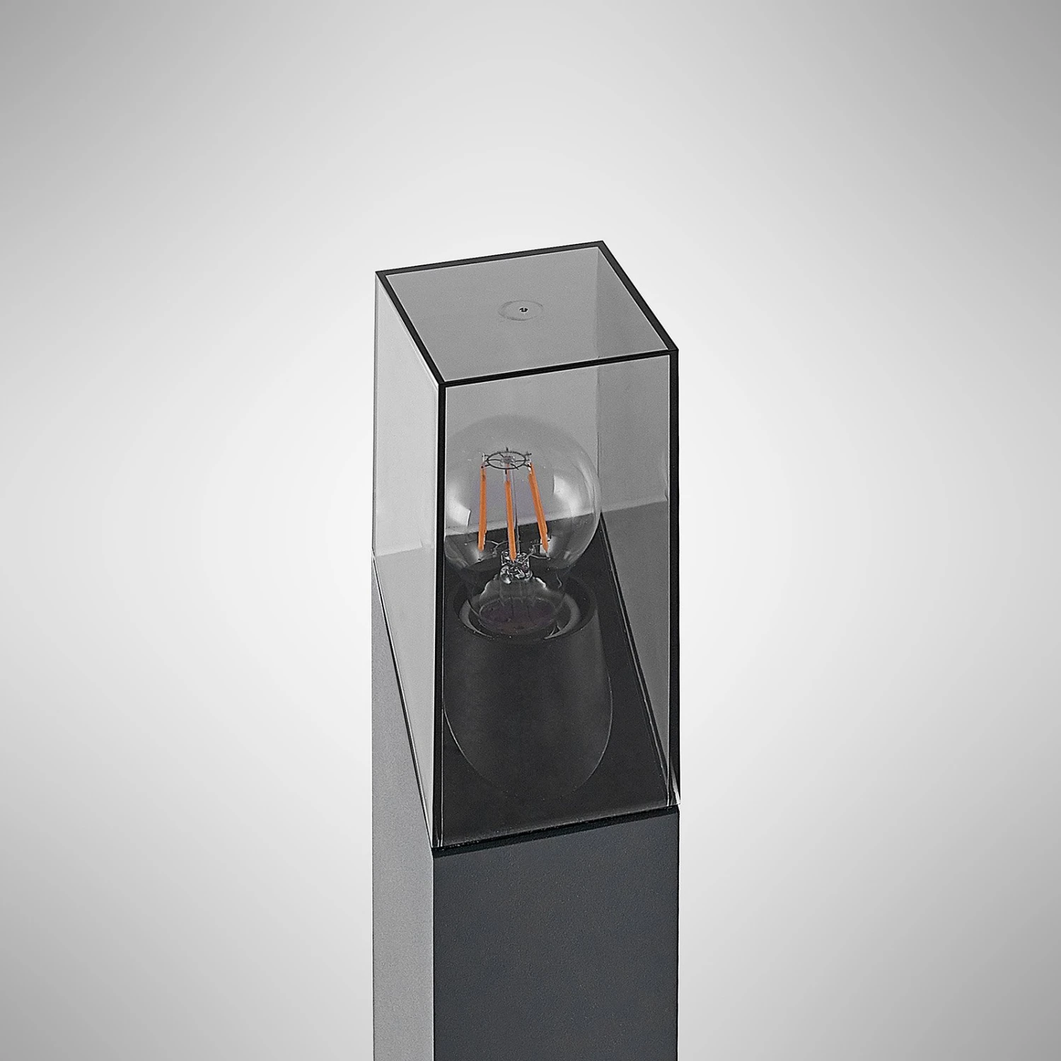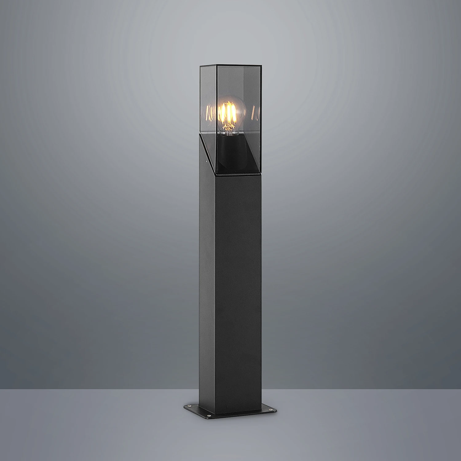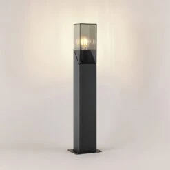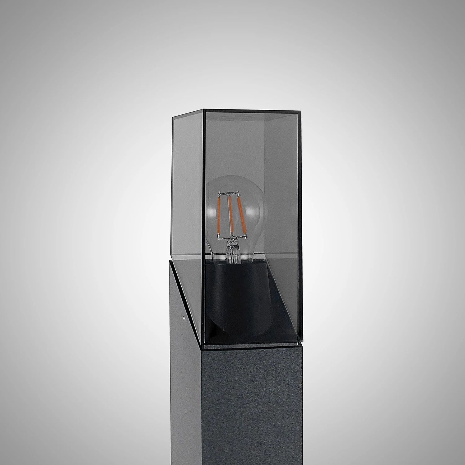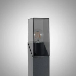 Ob an der Terrasse, im Garten oder auch an einer Außentreppe entlang eingesetzt, die moderne Sockelleuchte Fiola bietet eine gute und ausreichend helle Beleuchtung für die sichere Orientierung in den dunklen Abendstunden. Der moderne Korpus der Sockelleuchte besteht aus dunkelgrauem Aluminium, welcher mit einem Schirm aus rauchgrauem Kunststoff kombiniert wird. Das Leuchtmittel, welches hier nicht im Lieferumfang enthalten ist, zeigt sich offen, was einen Einsatz von dekorativen Filament- oder Retrofit-Lampen empfiehlt.