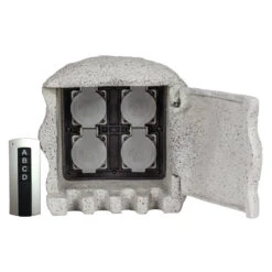 Dekorativ und überaus praktisch ist der Energieverteiler Piedra aus Polyresin, der in der Optik eines Granitsteines gefertigt wurde. Er bietet Platz zum Anschluss von vier Leuchten oder Geräten, kann bis zu einer Bemessungsleistung von 1.200 W belastet werden und ist mit einem 5 m langen Anschlusskabel H07RN-F3G1,5 ausgestattet. Über die ebenfalls im Lieferumfang enthaltene Funkfernbedienung mit einer Reichweite von bis zu 30 Metern lassen sich die vier Steckdosen einzeln ein- oder ausschalten. Schutzart IP44.