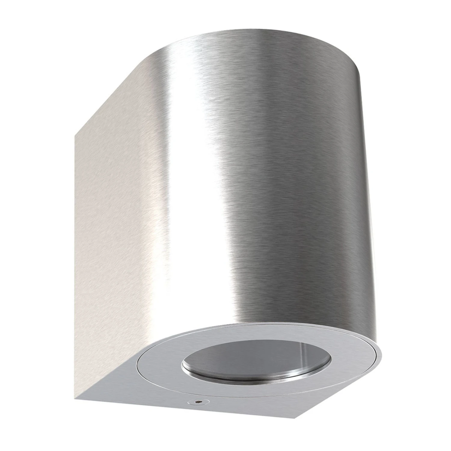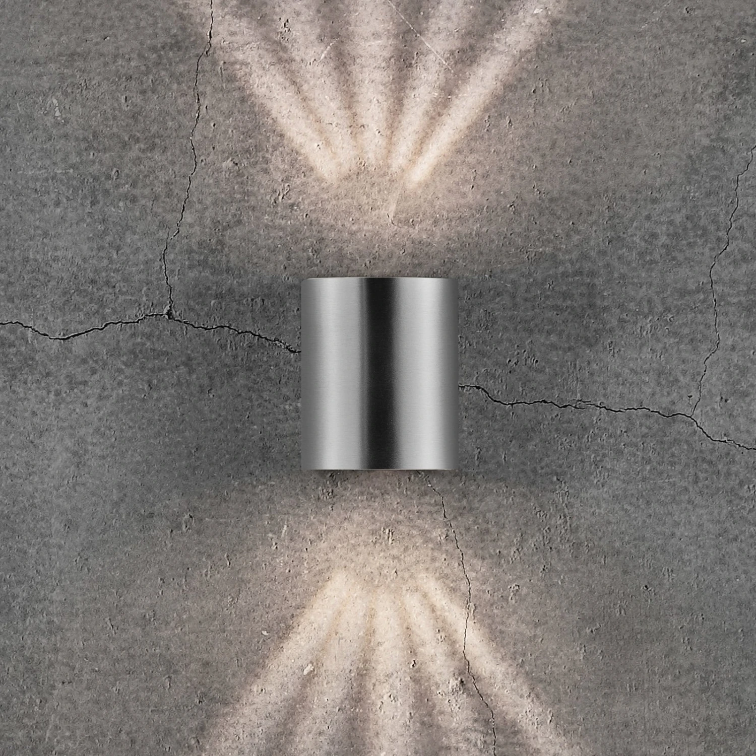 Die LED-Außenwandleuchte Canto 2 ist als Quader geformt, der an der Vorderseite abgerundet ist und hier einem Zylinder entspricht. Der aus Aluminium-Spritzguss gefertigte Korpus verfügt an Ober- und Unterseite über runde Öffnungen, die mit klaren Glasabdeckungen besetzt sind. Die dahinter liegenden LEDs emittieren in einem Ausstrahlwinkel von 120 ° warmweißes Licht, das in der Form von Up-and-Down-Beleuchtung den Außenbereich erhellt. Mitgelieferte Schablonen bieten zudem die Option, mittels gezielt gestalteter Lichtmuster an der Wand dekorative Akzente zu erzeugen.