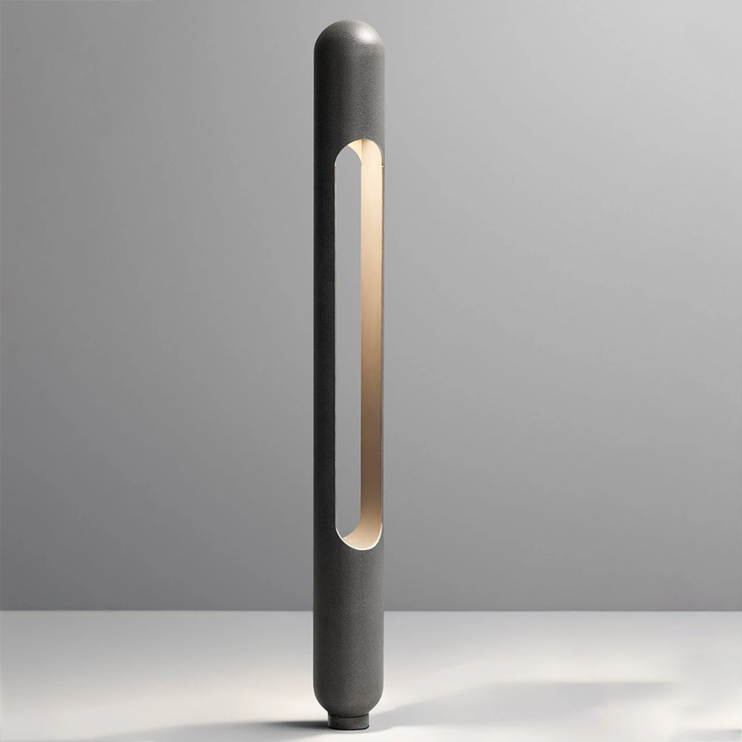 Eine hohe zylindrische Formgebung, komplettiert mit oval abgerundeten Enden, prägt das Design der LED-Wegeleuchte Grounding. Dies zeigt sich sowohl an der äußeren Form des Korpus als auch bei der langen Öffnung im Innern der Leuchte. Hier sind nach unten strahlende LEDs integriert, deren Licht die charakteristische Formgebung der Wegeleuchte betont und die Umgebung zu beiden Seiten blendfrei erhellt. Dank der herausragenden Farbwiedergabe (CRI 97) werden die Nuancen der Gestaltung der Wegeleuchte und anderer Objekte in der unmittelbaren Umgebung hervorragend inszeniert. Ein Montagesockel zur Verankerung im Untergrund ist separat erhältlich (siehe Zubehör).