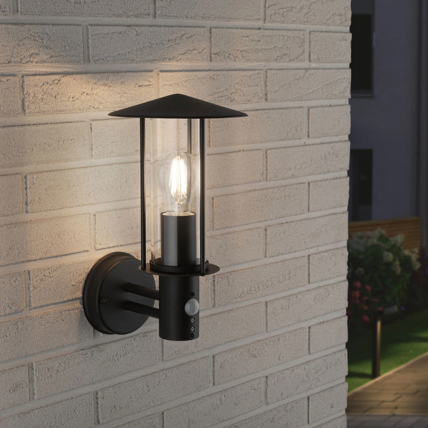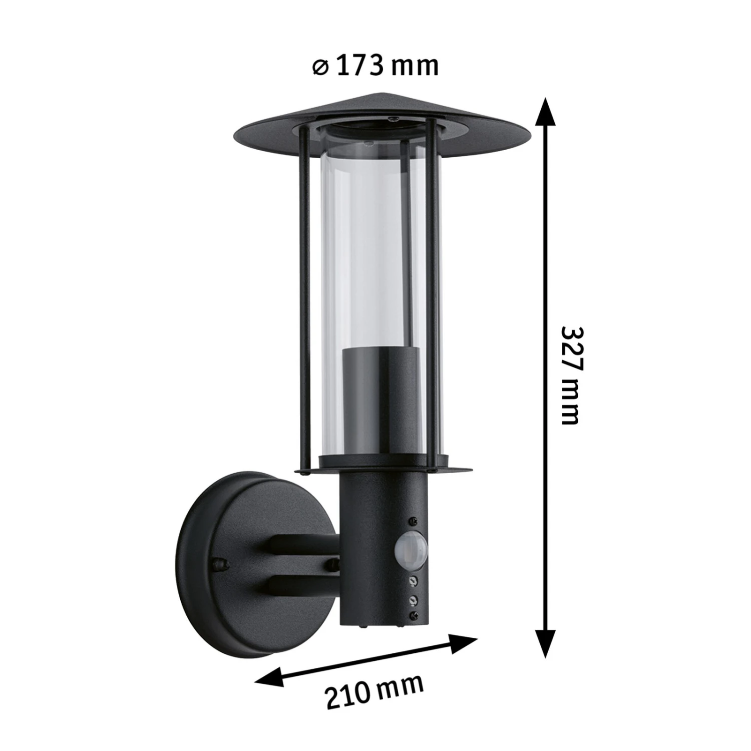 Schmal in moderner Laternenform und mit einem spitzen Dach wurde die Außenwandleuchte Classic aus Metall mit anthrazitfarbener Lackierung gestaltet und mit einem klaren Glaszylinder hinter den Metallstreben ausgestattet, durch den das Licht des Leuchtmittels hell und klar in alle Richtungen abstrahlen kann. Die Außenwandleuchte Classic ist mit einem Bewegungsmelder ausgestattet, der Bewegungen in einem Winkel von 90° in einer Reichweite von bis zu 8 Metern erfasst. Der Erfassungsbereich des Sensors ist einstellbar, ebenso wie die Leuchtdauer, die im Bereich von 55 Sekunden bis zu 5 Minuten gewählt werden kann. Die Dämmerungsschwelle liegt bei 20 lux.