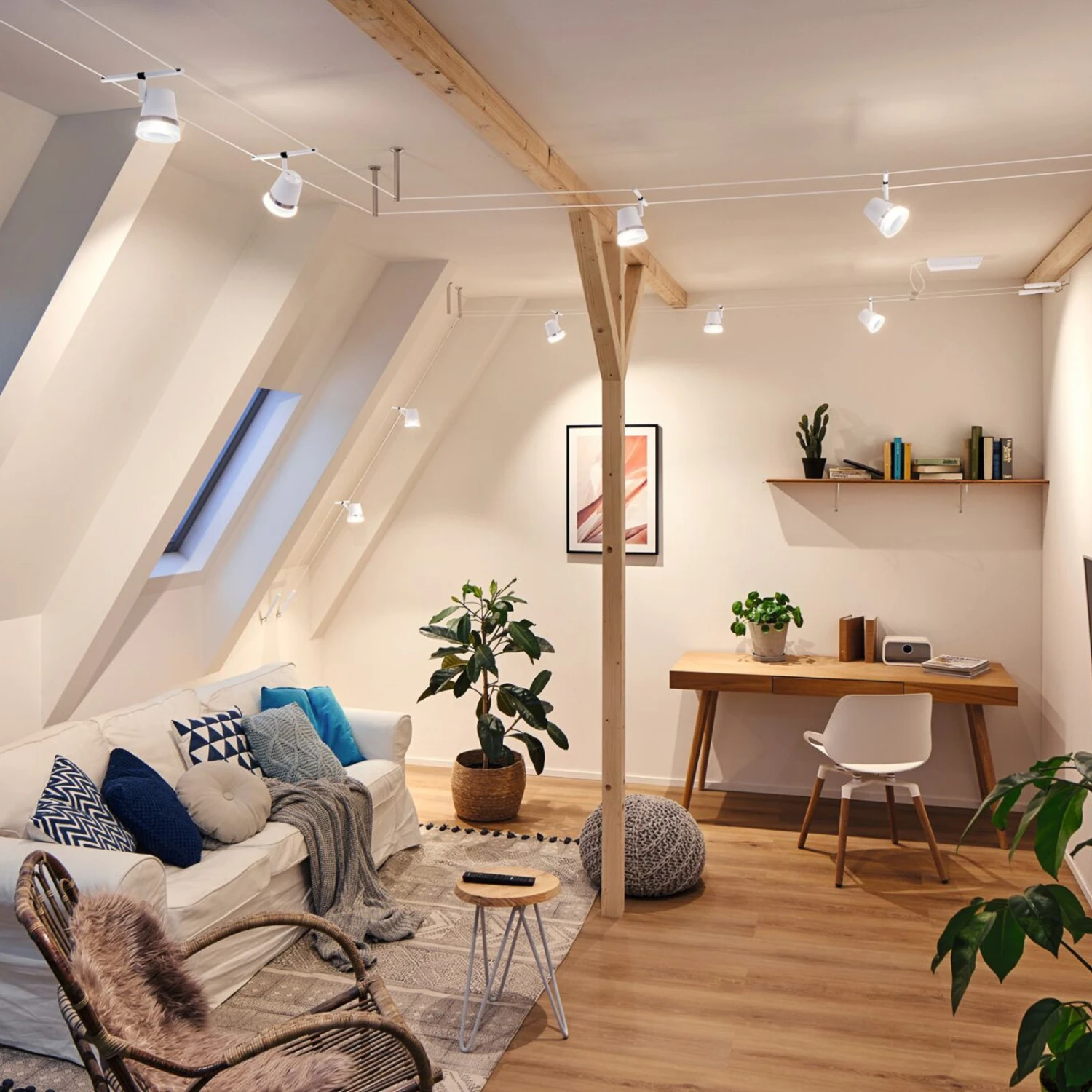 Mit dem Seilsystem Cone LED lässt sich jeder Raum effektiv und vor allem flexibel beleuchten. Ob gerade angebracht, an der Deckenschräge oder verwinkelt montiert – Seilsysteme bieten grenzenlose Gestaltungsmöglichkeiten und passen in jeden Raum. Das System besteht aus dem Seil, einem Trafo und fünf Leuchten, die sich beliebig am Seil anordnen lassen. Sie sind in leicht konisch zulaufender Form gestaltet und mit einem glänzenden Zierring sowie einem satinierten Ring an der Öffnung gearbeitet und lassen sich schwenken und drehen, so dass ihr Licht bis in jede Ecke eines Raumes reicht und sich verschiedene Raumbereiche oder Einrichtungsgegenstände gezielt beleuchten lassen.