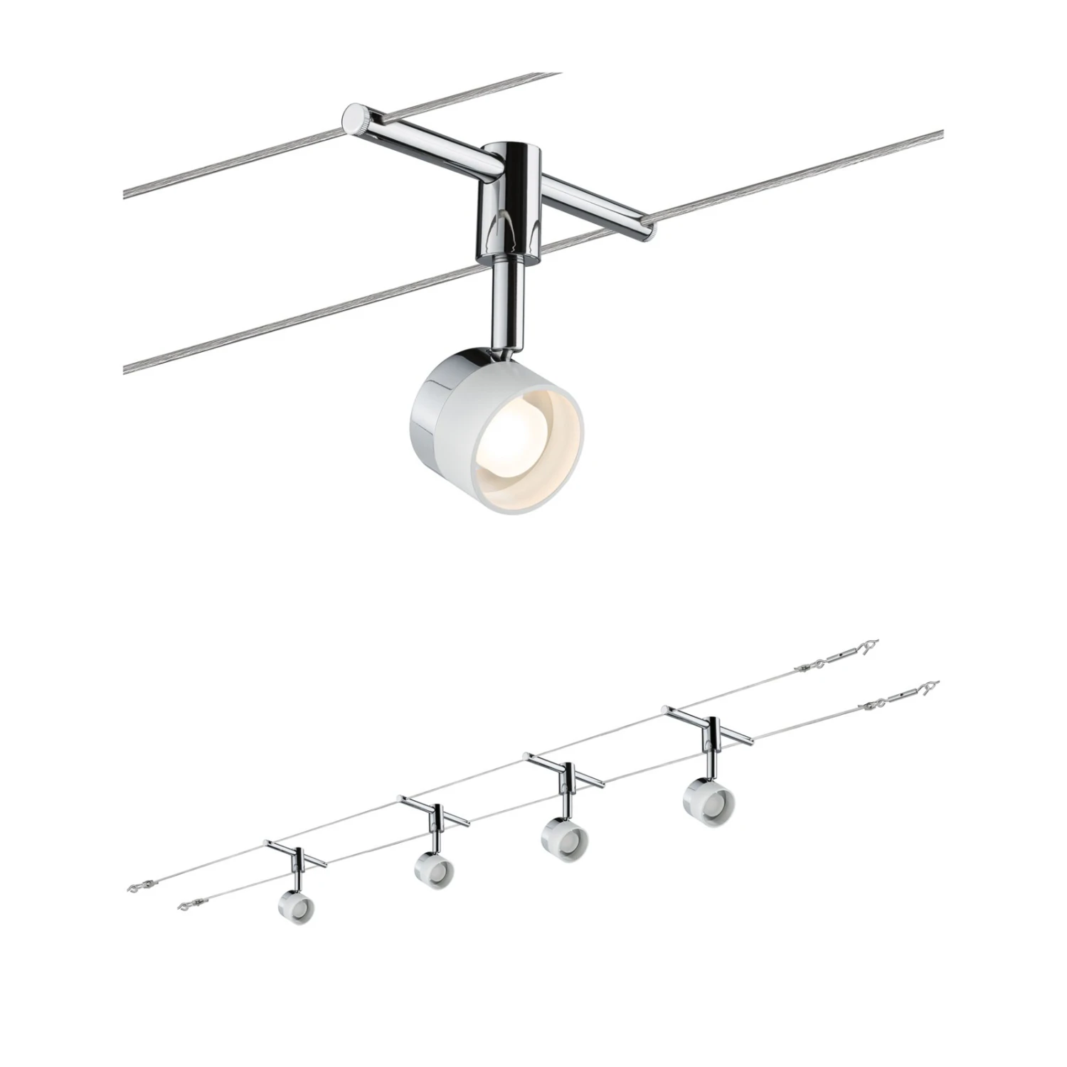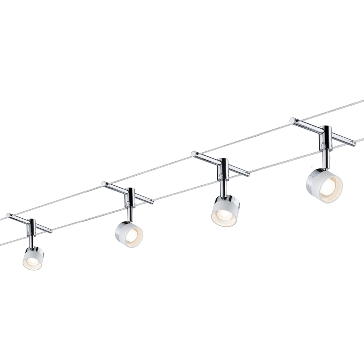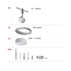 Dieses innovative Seilsystem mit einer Gesamtleistung von 20 W ermöglicht individuelle Lichtlösungen für den modernen Wohnraum und sorgt für eine weitläufige Lichtstreuung. Der Seilabstand beträgt 16 cm. In der Lieferung enthalten sind vier runde Seilleuchten, 10 m Seil 2,5 mm², Trafo 30 VA sowie eine Montageanleitung.