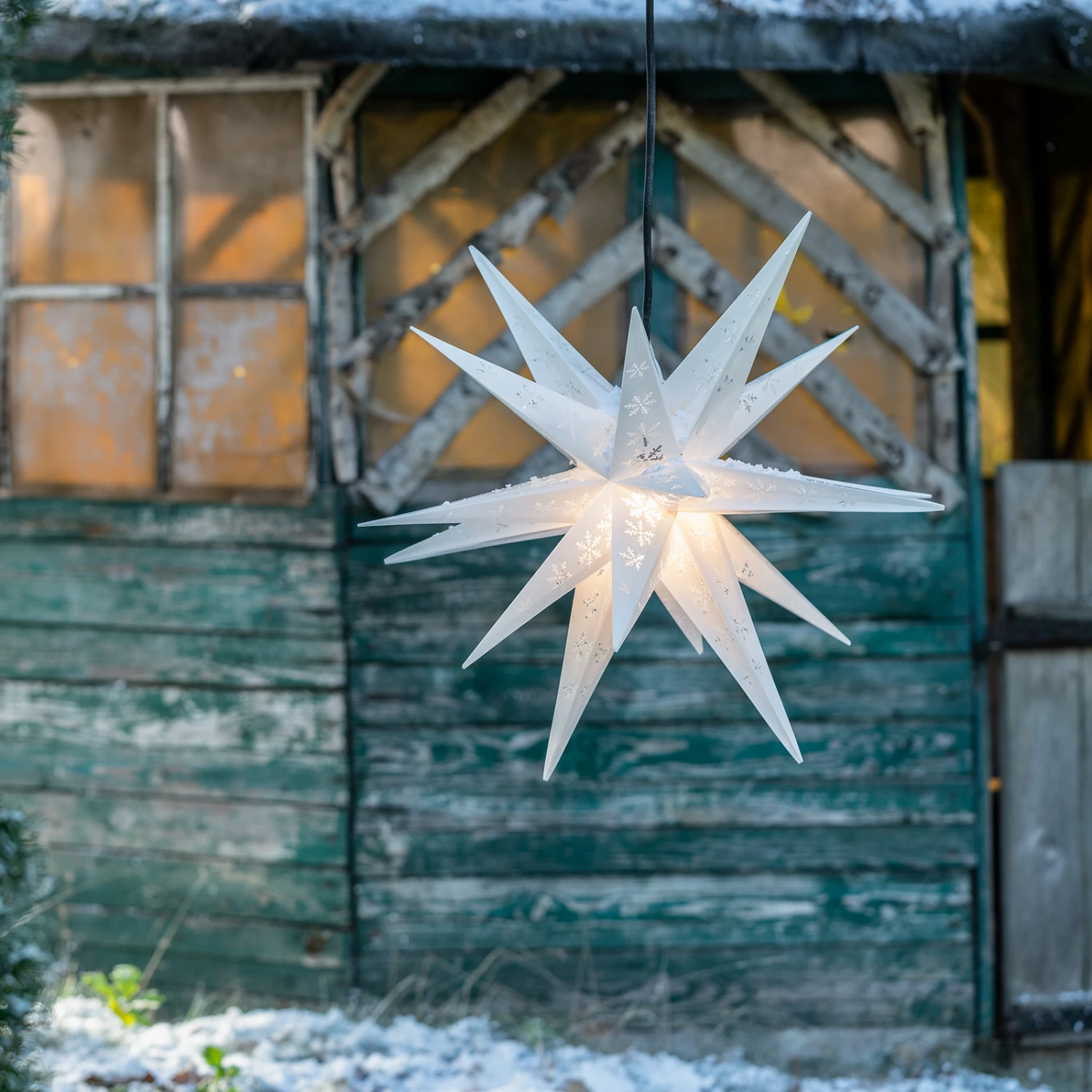 Dieser weiße Deko-Stern leuchtet nicht nur hell in die Nacht hinein. Er weist auch ein faszinierendes Muster aus aufgedruckten Schneeflocken auf, das gemeinsam mit der dekorativen Form des 18-zackigen Sterns aus dem Stern eine sehr auffällige Außendekoration macht.