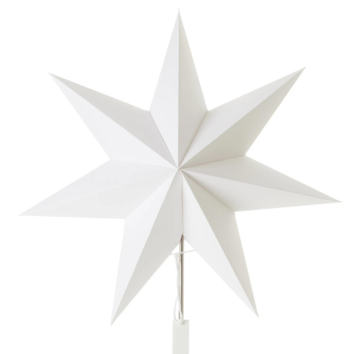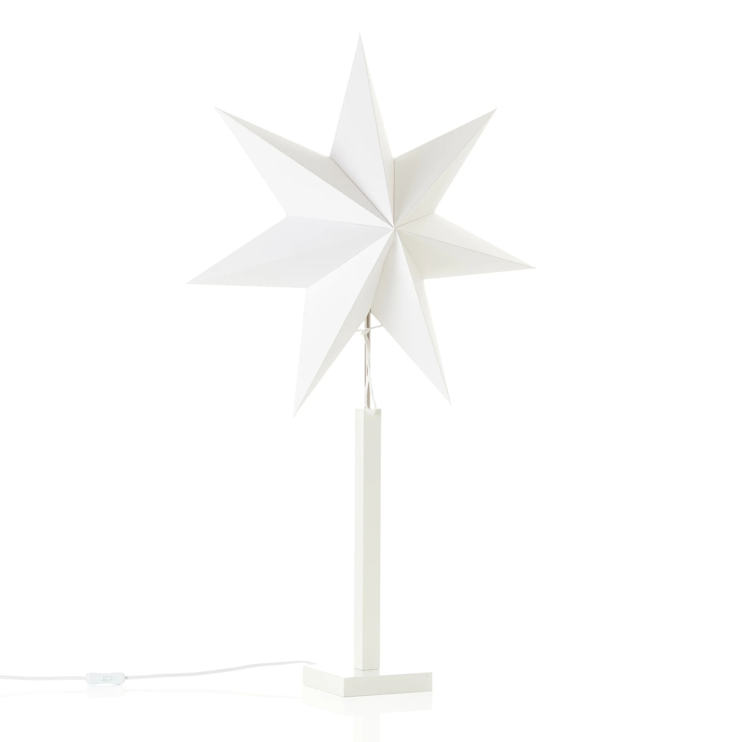 Der siebenzackige Papierstern Karo thront auf einem Gestell aus Metall und ist mit einem rechteckigen Holzfuß bestückt. Karo verbreitet mit seinem sanften Lichtschein eine gemütliche Atmosphäre. Eine schnell platzierte Deko für Kommoden, Tische, Regale und Fensterbänke. In das Gestell ist eine E14-Fassung integriert, in die alle Arten von Leuchtmitteln mit E14-Sockel eingesetzt werden können. Entsprechende Lampen können über Zubehör gekauft werden. Mit Schalter am Kabel ausgestattet.