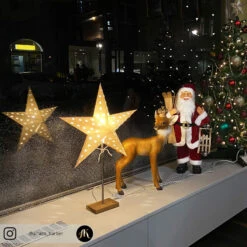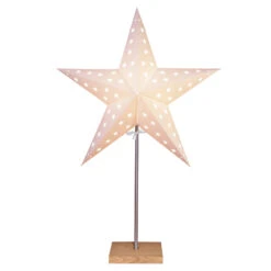 Für diesen attraktiv gestalteten fünfzackigen Papierstern Leo auf Metallgestell und hölzernem Fuß findet sich in jeder Wohnung schnell der geeignete Platz. Das weiße Papier des Sterns ist mit einem Muster aus zahlreichen kleinen Sternchen versehen, die aus dem Papier ausgestanzt wurden. So kann das Licht der eingesetzten Lampe nach allen Seiten durch die kleinen Ausstanzungen entweichen und verbreitet ein gemütliches Flair im Raum. Geeignete Leuchtmittel sind unter Zubehör zu finden.