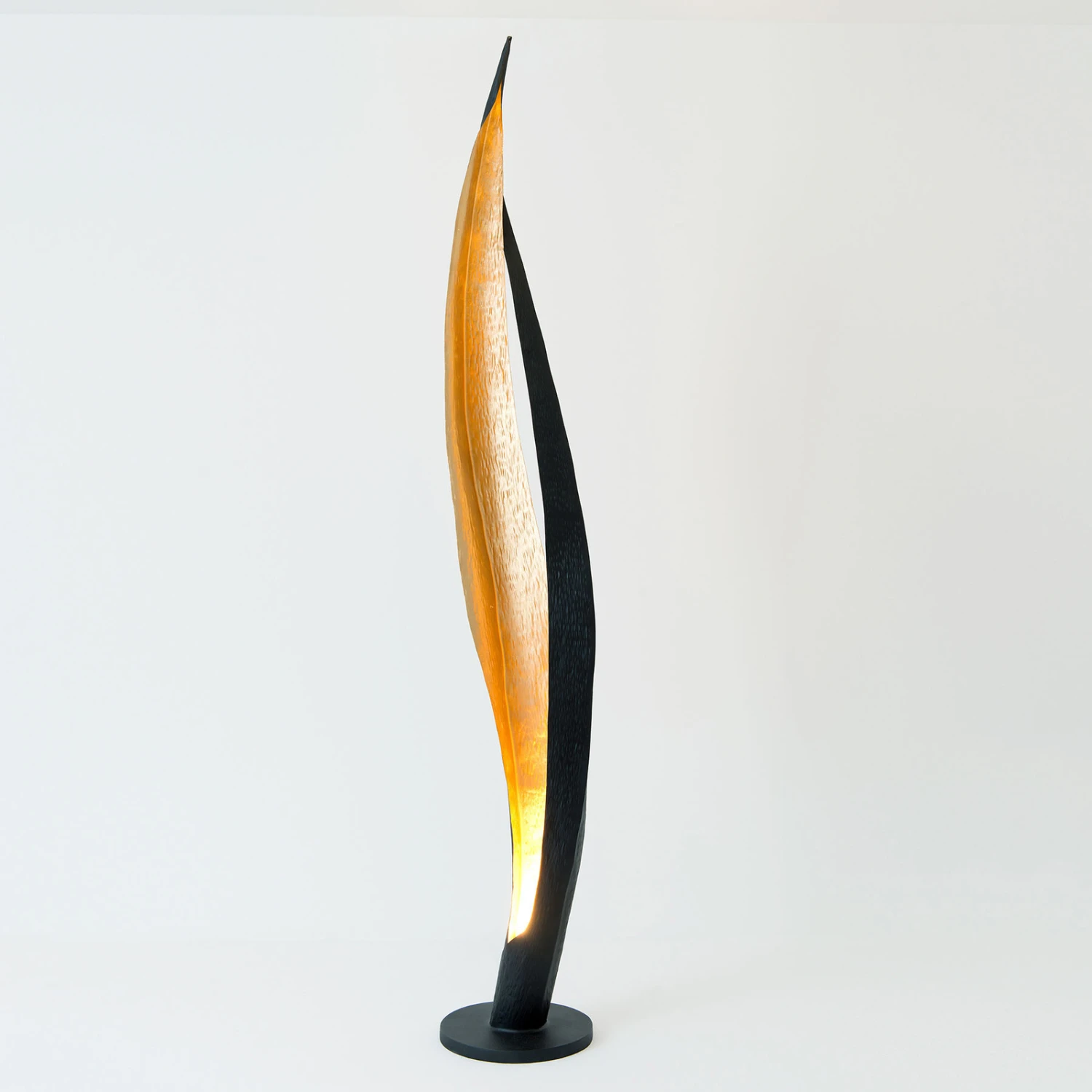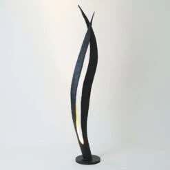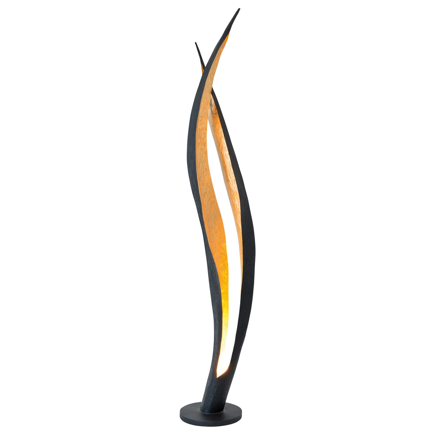 Ein besonderes Leuchtenaccessoire, das zum einen für eine effektvolle, atmosphärische Zusatzbeleuchtung im Wohnzimmer sorgt, und zum anderen auch unbeleuchtet als dekorativer Blickfang dient, stellt die Stehleuchte Barbone dar. Vom schlichten Fuß aus erstrecken sich – in der Form exotischen Blättern ähnlich – zwei Elemente nach oben in den Raum, die von außen schwarz-braun und von innen goldfarben gehämmert sind. Direkt über der Bodenplatte ist mittig eine GU10-Fassung verbaut, die mit einer passenden Lampe nach Wahl bestückt werden kann (siehe Zubehör). Das Licht der eingesetzten Lampe bringt die Schönheit von Barbone dann voll zur Geltung, in Kombination mit dem Goldton wird eine glanzvolle, behagliche Lichtstimmung erzeugt.