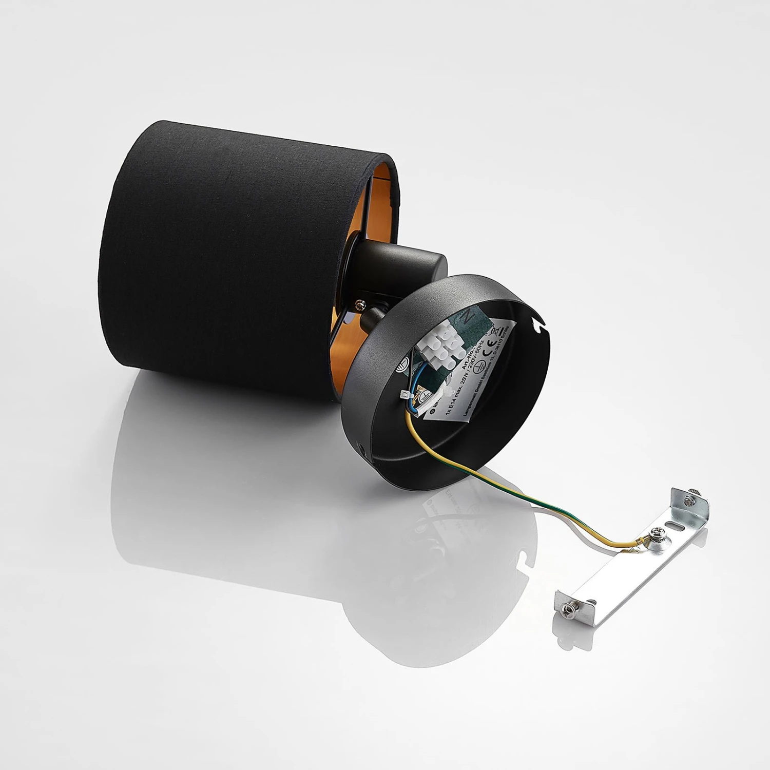 Dank des schwarzen Äußeren präsentiert sich die Lampe als dezenter Hingucker, der angeschaltet zum echten Highlight wird. Das goldene Innere schenkt dem Licht einen edlen Schimmer, der durch den Stoffbezug auch rückwärts an die Wand strahlt. So können besondere Bilder oder andere Einrichtungsgegenstände, an denen das Herz hängt, stimmungsvoll in Szene gesetzt werden.