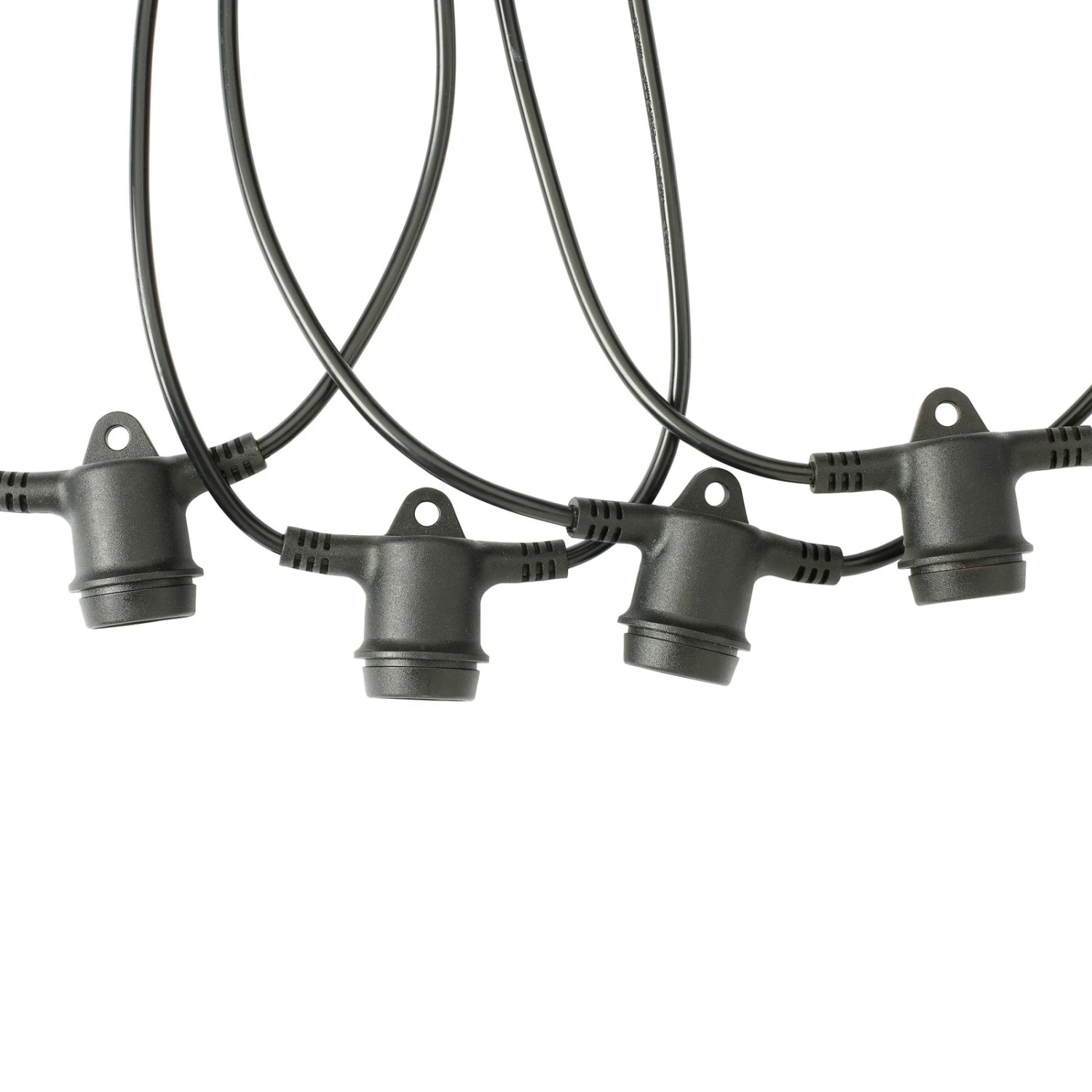 Zur Erweiterung einer Außen-Lichterkette Festoon String ist diese Lichterkette vorgesehen. Sie ist mit einem Gummikabel und mit 12 E27-Fassungen zur Bestückung mit LED-Lampen ausgestattet. Die Lichterkette lässt sich dank Verbindungskabel einfach mit der Grundkette verbinden und kann beliebig bis zu insgesamt 30 Ketten erweitert werden.
