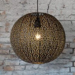 Diese Pendelleuchte haucht einfach jedem Raum orientalisches Flair ein. Vor allem wird dies durch das filigran ausgearbeitete Muster im kugelrunden, schwarzen Metallschirm erzielt, der bereits in ausgeschaltetem Zustand eine sehr dekorative Wirkung im Raum erzielt. Besonders gemütlich wird es, schaltet man das Licht hinzu, das durch die filigranen Muster im Schirm auf besonders angenehme Art und Weise in die Umgebung abgegeben wird.
