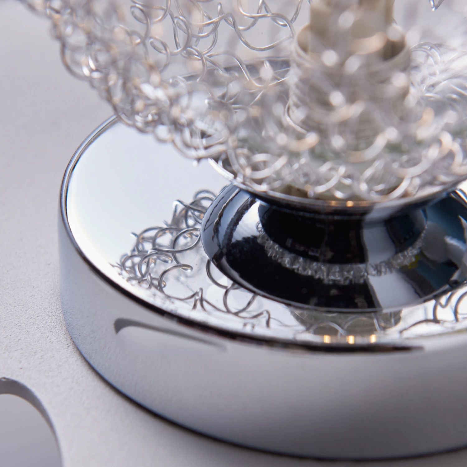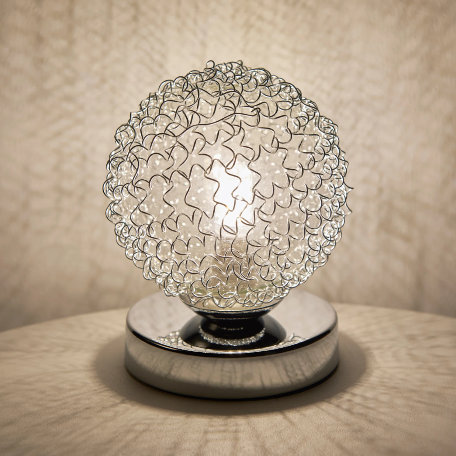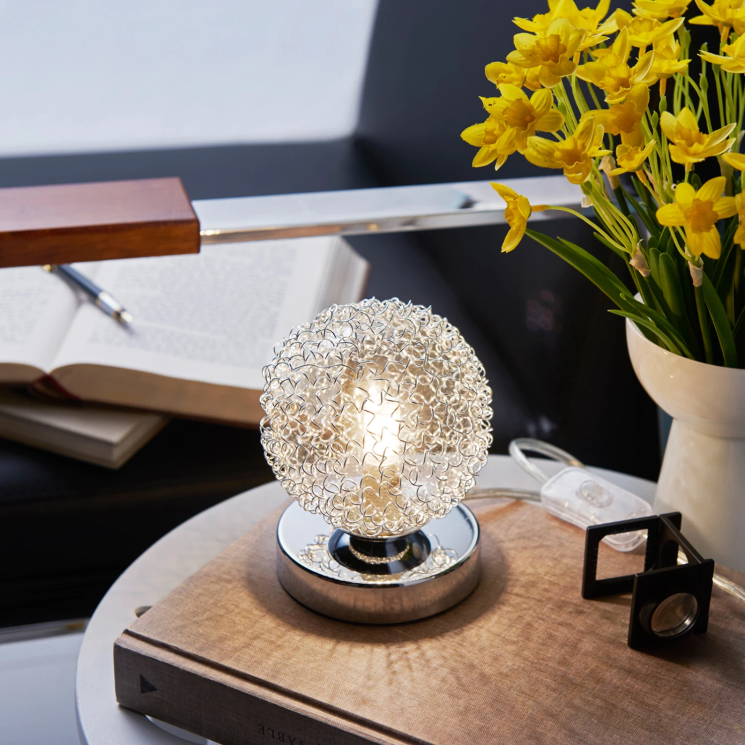 Mit ihren kompakten Baumaßen ist diese Tischleuchte ein praktischer Lichtspender für den Nachttisch neben dem Bett. Der runde, verchromte Fuß wird ergänzt von einer kleinen Kugel, die zum einen aus klarem Glas besteht und zum anderen ein filigran gearbeitetes Metallgeflecht hat, das über dem Glas sitzt. Der Lichtschein wirkt somit weniger blendend und scheint wohnlicher in den Raum.