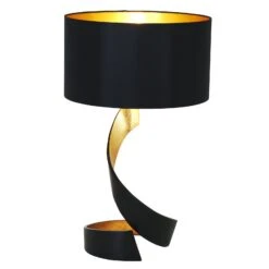 Textil-Tischleuchte Vortice mit dekorativ geschlängelten Eisenfuß Vortice zieht alle Blicke auf sich: Ihr Fuß besteht aus einem Eisenband in Schwarz und Gold, das sich in die Höhe schlängelt. Darauf thront ein Stoffschirm aus Chintz. Die Außenseite des Schirms ist schwarz. Das goldfarbene Schirminnere verleiht dem abstrahlenden Licht des eingesetzten Leuchtmittels (E27, nicht enthalten) eine fast magische Wirkung. Das Zuleitungskabel ist schwarz und mit einem Schalter ausgestattet, über den sich die Beleuchtung bequem ein- und ausschalten lässt.