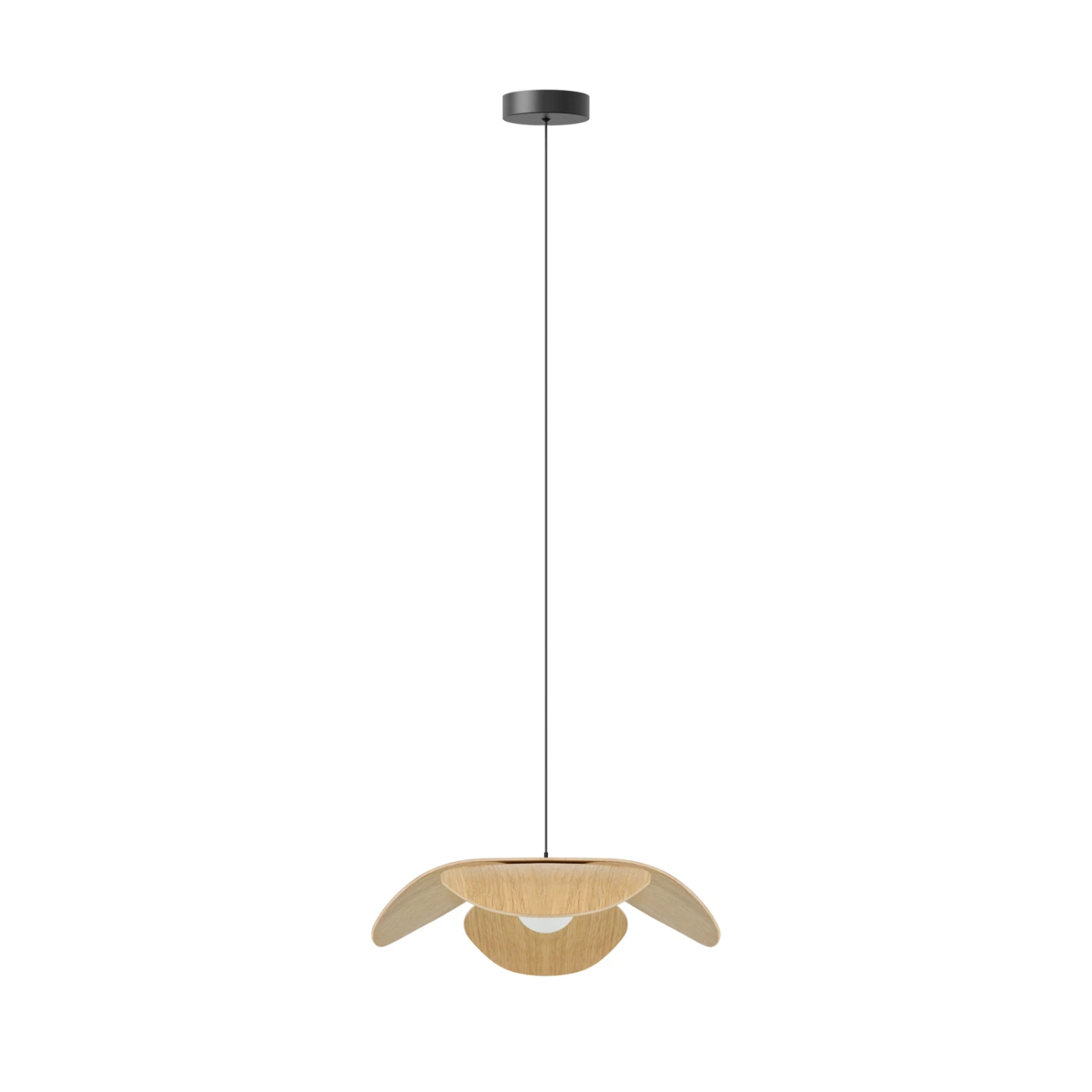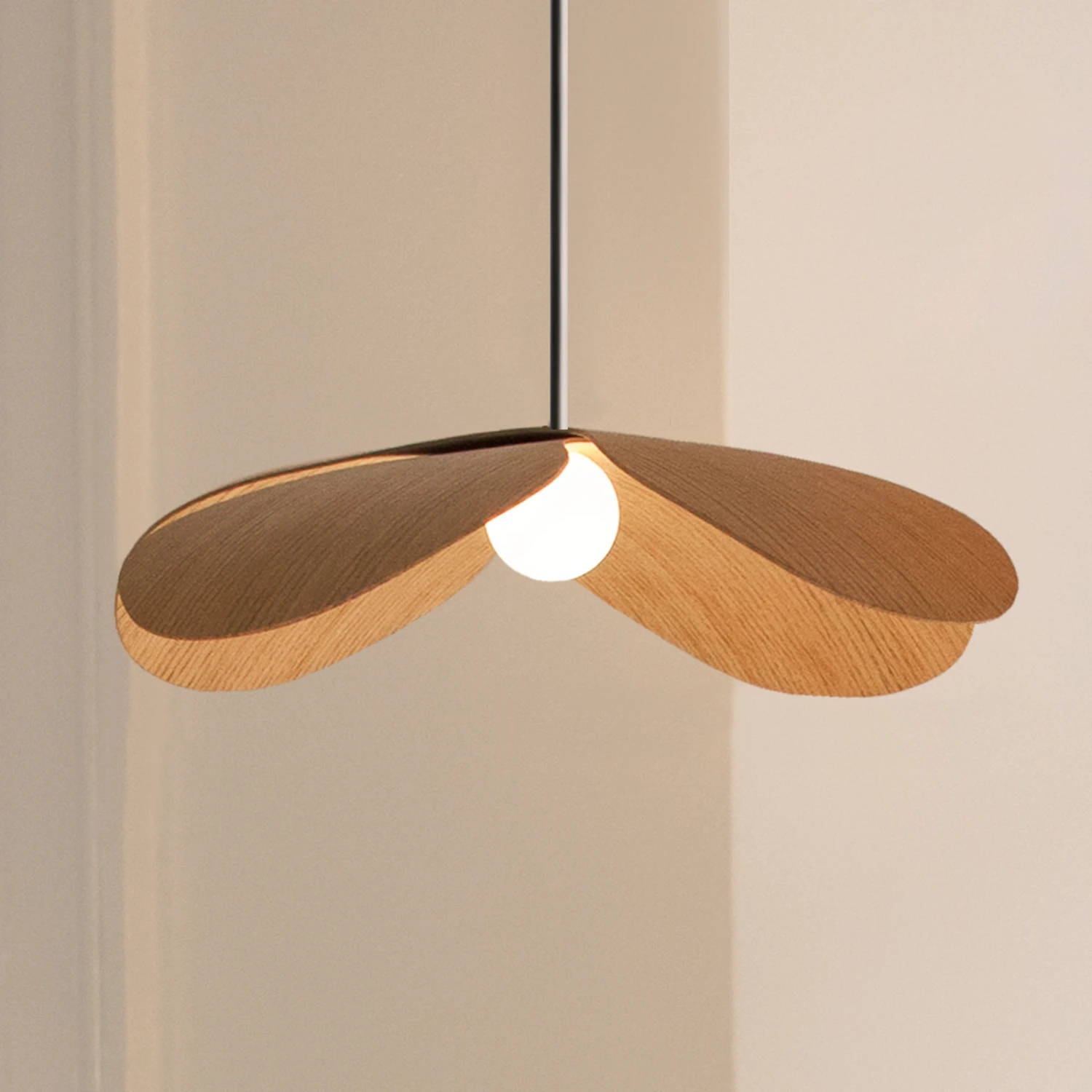 Der Schirm der Leuchte besteht aus Eichenholzfurnier. Dieses bildet die Blütenblätter des Vergissmeinnichts. In der Mitte der „Blüte“ befindet sich ein kugelrunder Diffusor aus Kunststoff, der das Licht blendfrei im Raum verteilt. Die Pendelleuchte kann einzeln oder auch zu mehreren nebeneinander aufgehängt werden, so dass z. B. ein großer Esszimmertisch oder eine Theke ausgeleuchtet werden können.
