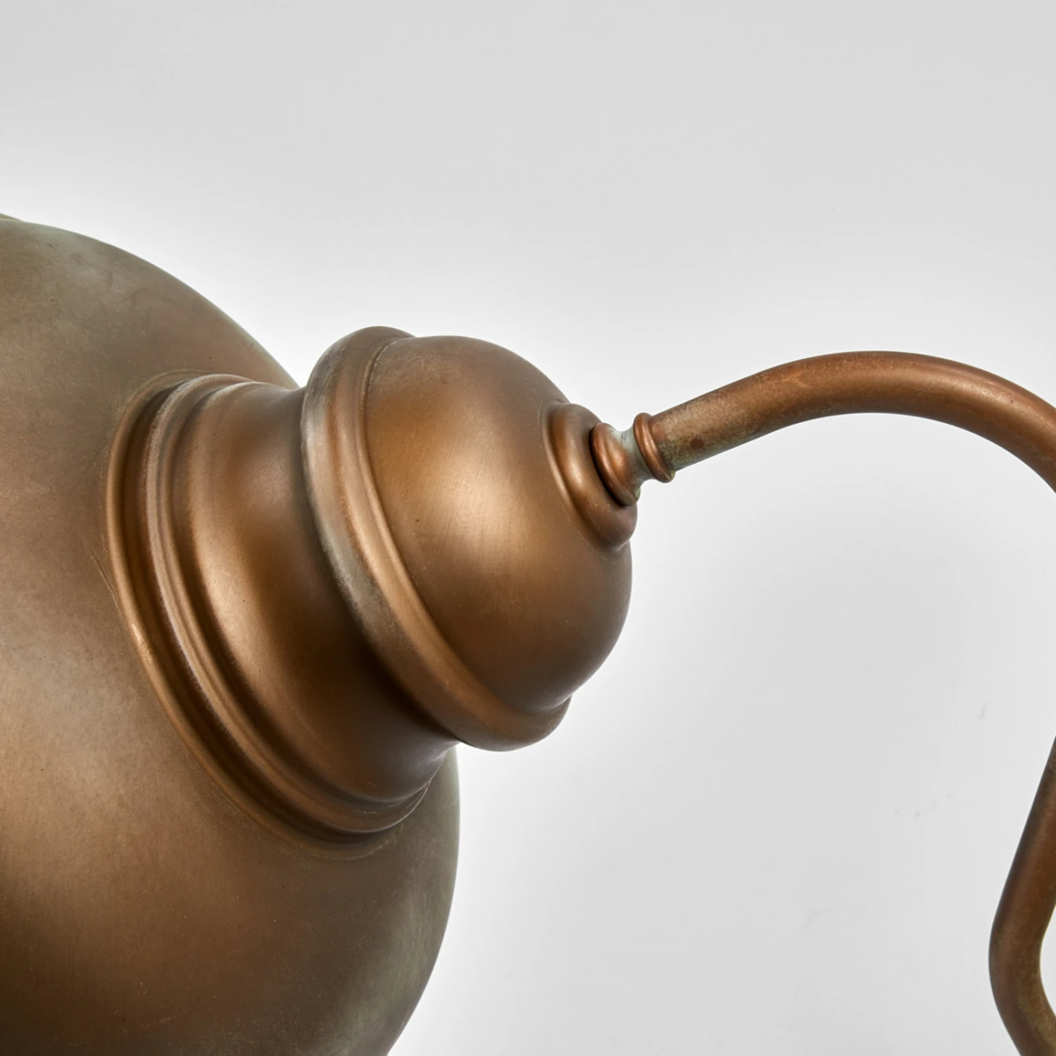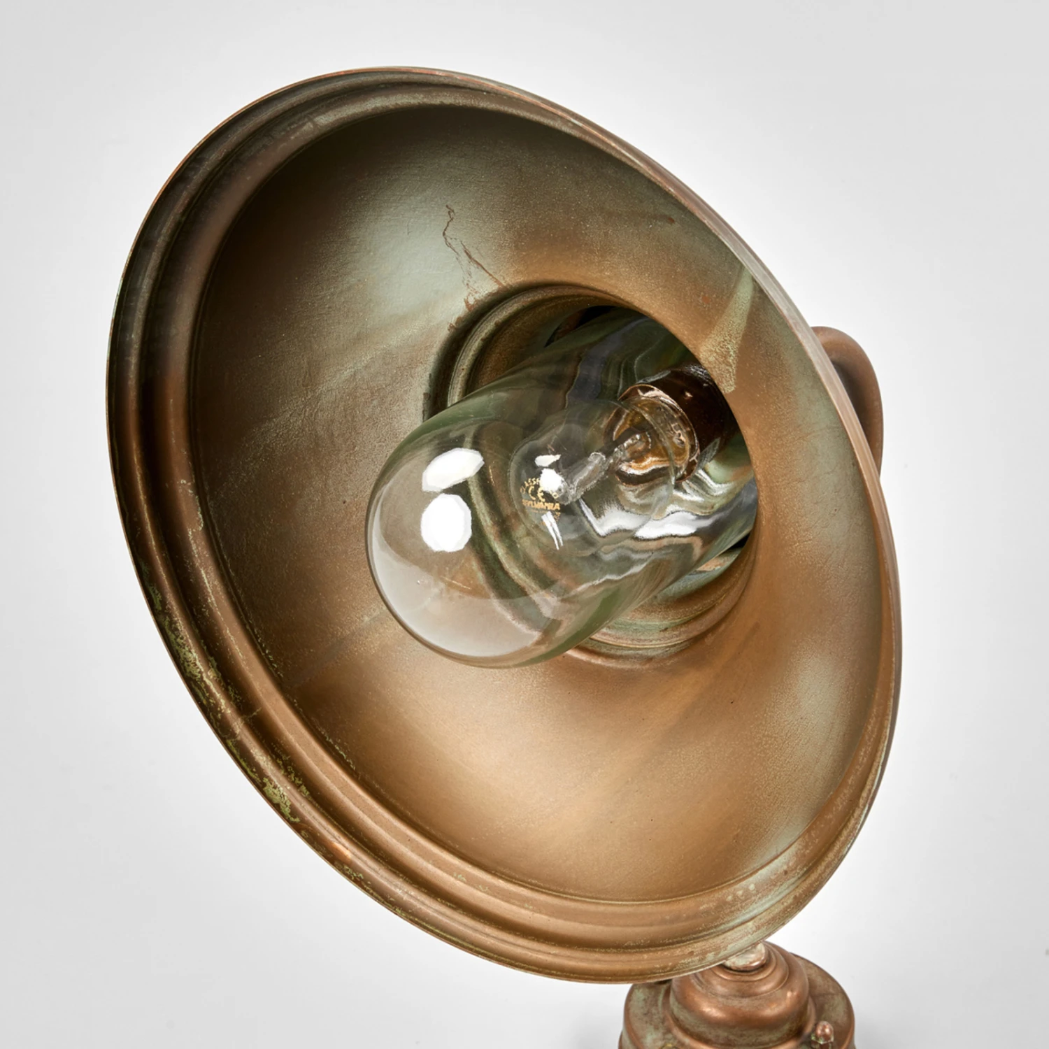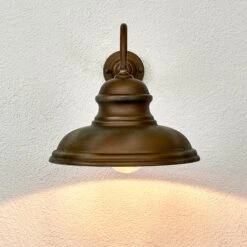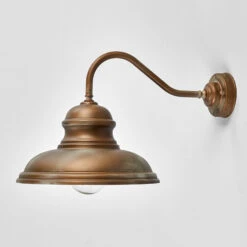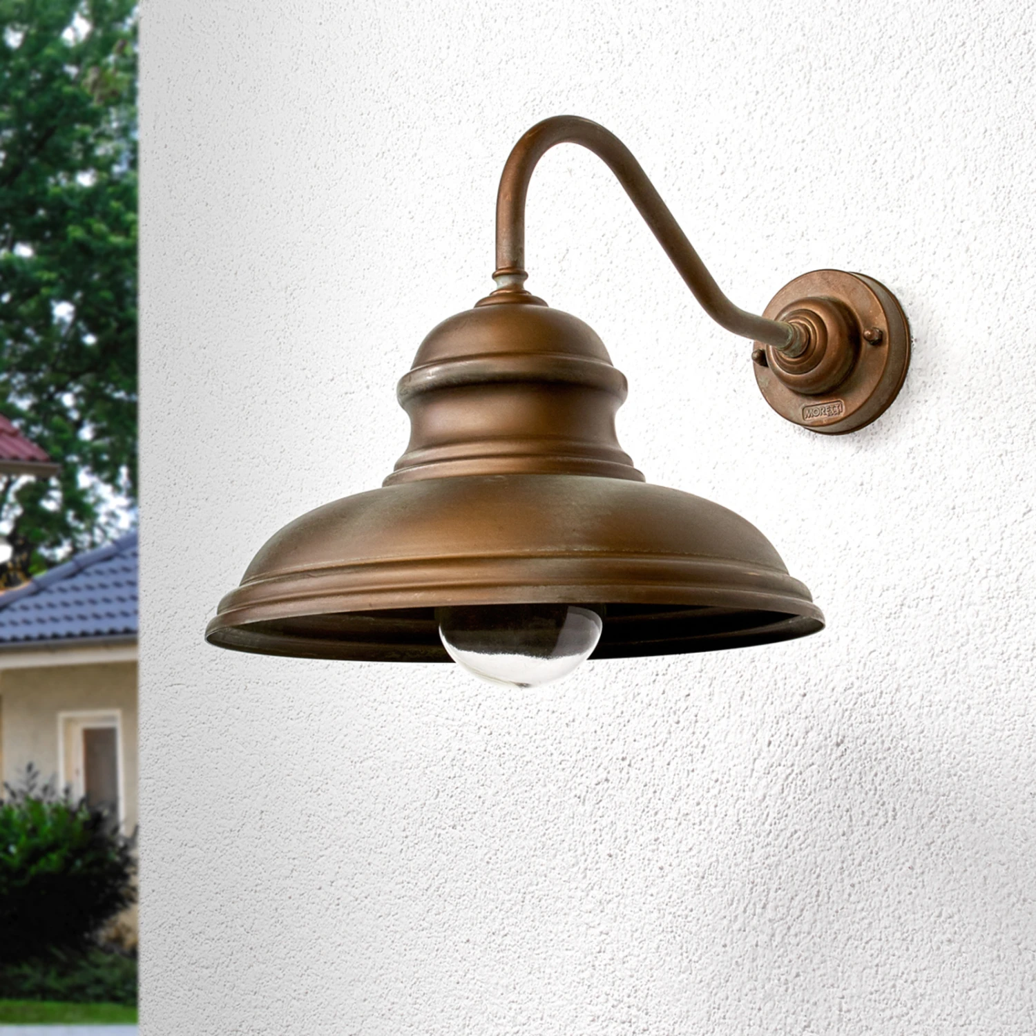 Diese Wandleuchte aus antikisiertem Messing besitzt einen großen runden Schirm, der an einer romantisch geschwungenen Halterung angebracht ist. Selbstverstädlich ist diese Wandleuchte mit der Schutzklasse IP44 gegen das Eindringen von Schmutz und Spritzwasser geschützt und kann somit gut im Außenbereich genutzt werden. Aufgrund des transparenten Glases wird ein helles, klares Licht abgegeben, das gut als Orientierungslicht eingesetzt werden kann. Außerdem ist diese Außenwandleuchte resistent gegen Korrosion durch Salz.