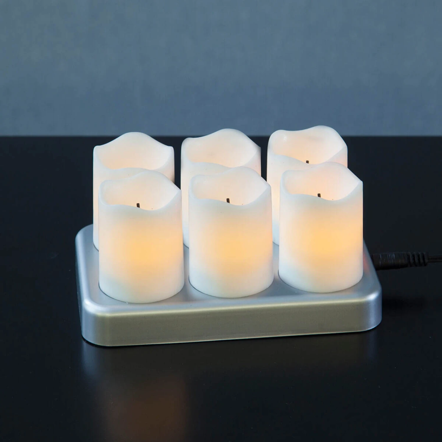Kerzen kann man nie genug haben: Mit diesem sechs weiße LED-Kerzen umfassenden Set Chargeme ist man für alle Dekofälle gerüstet. Die Kerzen sind mit aufladbaren Akkus (NiMH) bestückt. Nach Gebrauch werden sie einfach auf der Ladestation platziert und sind dann schnell wieder für den nächsten Einsatz gerüstet. Die Kerzen haben einen leicht unregelmäßigen Rand und sehen deshalb sehr authentisch aus. Die LEDs leuchten gelb.